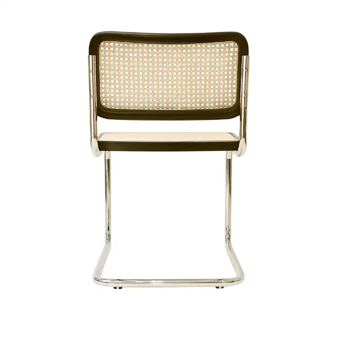 Der Cesca-Stuhl kombiniert ein Rohrstahlgestell mit einer polierten Chromoberfläche, die kratz- und korrosionsbeständig ist. Die Sitzfläche und die Rückenlehne sind aus handgewebtem Naturrohr gefertigt, das in einem soliden Holzrahmen, typischerweise aus Buche, montiert ist, mit einer klaren oder gefärbten Oberfläche, die die Holzmaserung betont. Die Mischung aus Stahl, Holz und Rohr verkörpert das Bauhaus-Ideal, industrielle Technologie mit traditioneller Handwerkskunst zu verbinden.