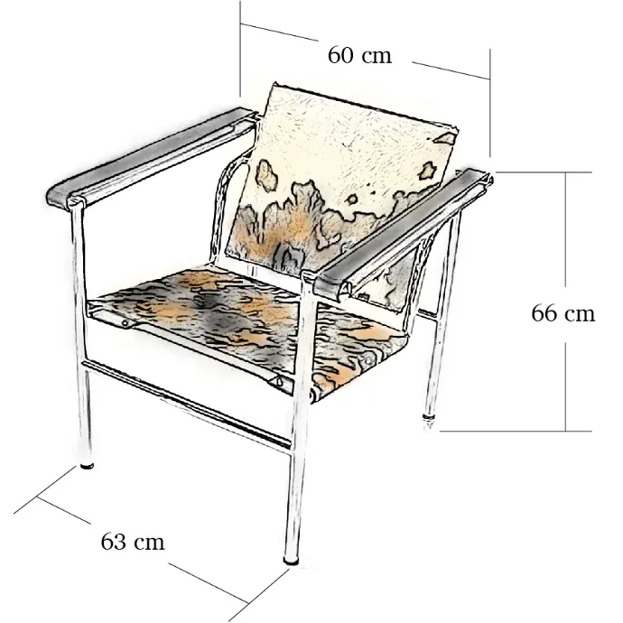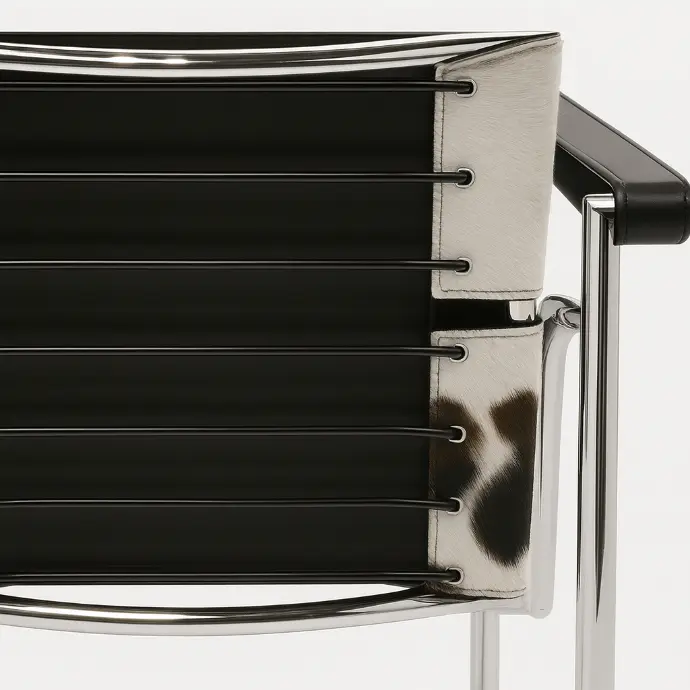 The LC1 Chair features a tubular steel frame in polished chrome, providing resistance to scratches and oxidation. The seat, backrest, and armrests are upholstered in high-quality aniline leather or hide, supported by tensioned straps for stability. The contrast between slender steel elements and taut leather surfaces reflects the Bauhaus ideal of functional elegance and material clarity.