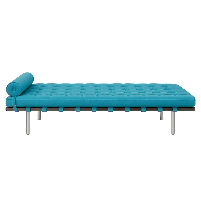 The thickly padded leather mattress provides firm yet resilient comfort, suitable for reclining, seating, or lounging. The removable bolster offers flexible head or arm support. Despite its sculptural elegance, the Barcelona Daybed is highly functional, serving as both a centerpiece in modern interiors and a practical seating solution. Its timeless geometry and luxurious materiality ensure integration into both residential and public environments.