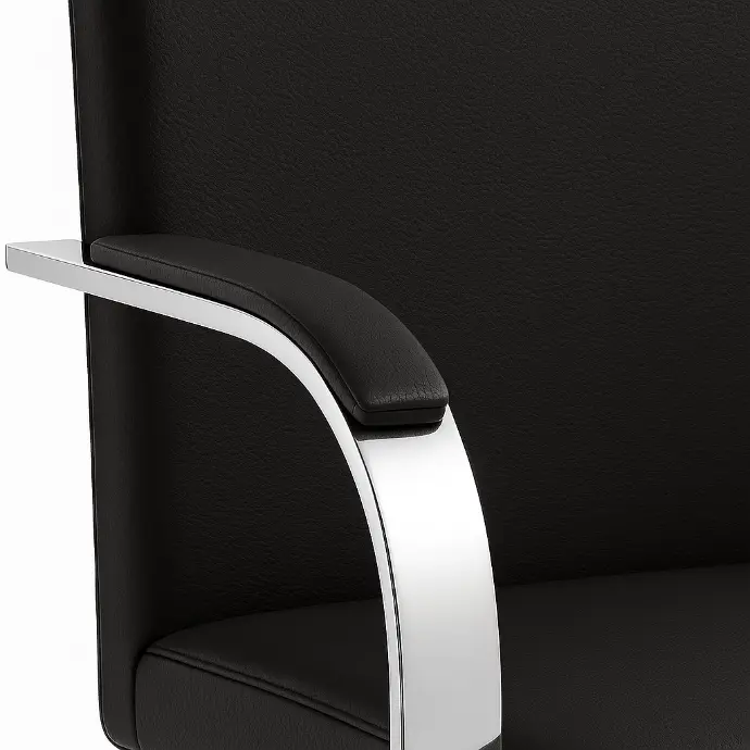 The frame is cut and precision-formed from flat stainless steel strips, welded and polished to create a seamless cantilever structure. The seat and backrest are fixed onto the frame with concealed fasteners, emphasizing the chair’s clean lines. Reinforced stitching ensures longevity of the leather upholstery, while the flat steel profile provides rigidity with a refined geometric presence.