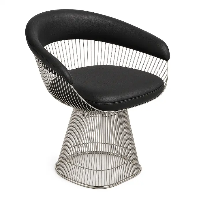 The chair provides ergonomic support through its curved backrest and generously padded seat cushion. The open wire structure allows air circulation, while the upholstered elements offer softness and resilience. Despite its sculptural form, the Platner Armchair is practical for dining, lounge, or office settings. Its balance of comfort, durability, and artistry makes it both a functional seat and a design statement.