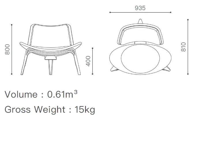 The chair features a distinctive three-legged base, made from laminated and molded plywood for strength and stability. The broad, wing-shaped seat and curved backrest are precision-molded to provide ergonomic support. All joints are reinforced, and the veneer is finished with a protective lacquer for durability. The combination of layered plywood and fine upholstery highlights Wegner’s craftsmanship in balancing structure and form..