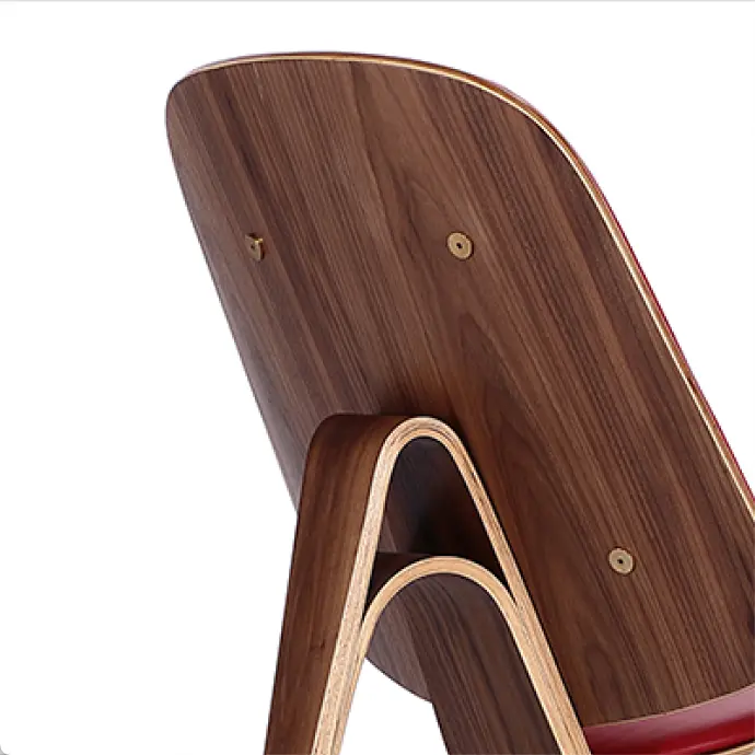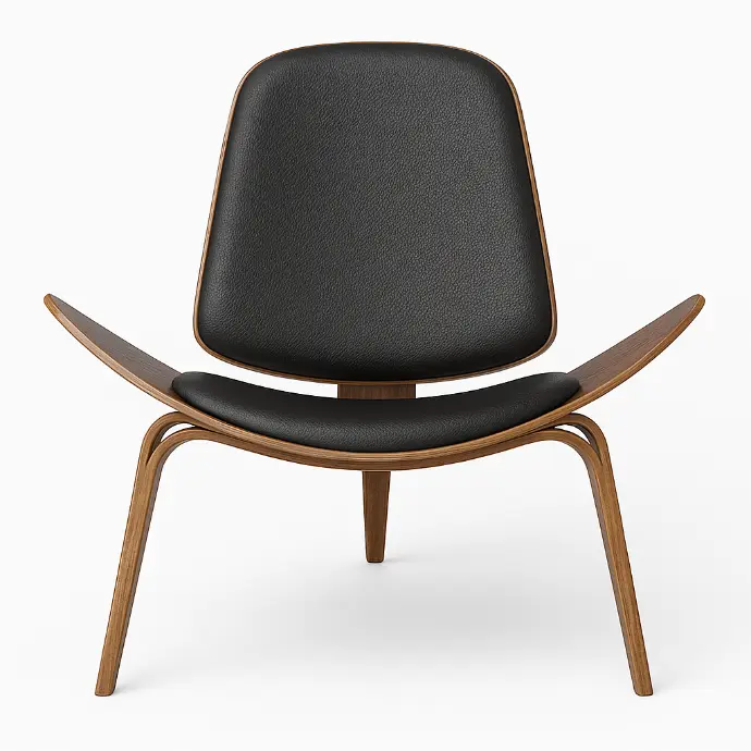 The Shell Chair is constructed from molded plywood with a natural veneer finish, commonly offered in walnut, oak, or ash. The seat and backrest are upholstered in high-quality aniline leather or fabric, filled with molded foam for comfort. The exposed wood grain contrasts with the smooth upholstery, creating a striking modernist aesthetic.