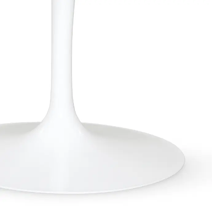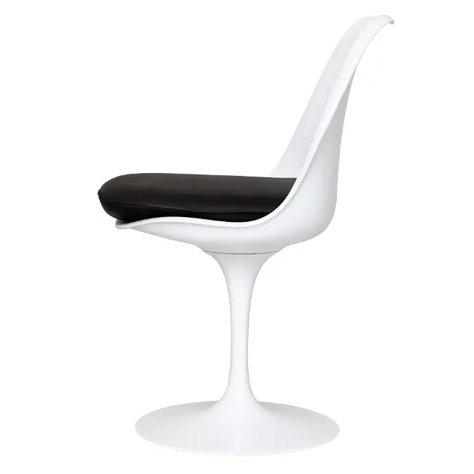 The Tulip Side Chair features a sculptural pedestal base cast from molded aluminum, finished with a protective white or black lacquer. The seat shell is made from reinforced molded fiberglass or plastic, upholstered with a removable cushion in fabric or leather. The smooth, continuous surfaces highlight Saarinen’s modernist pursuit of material purity and form reduction.
