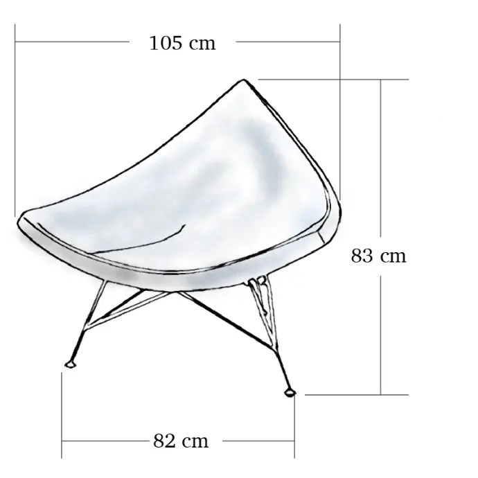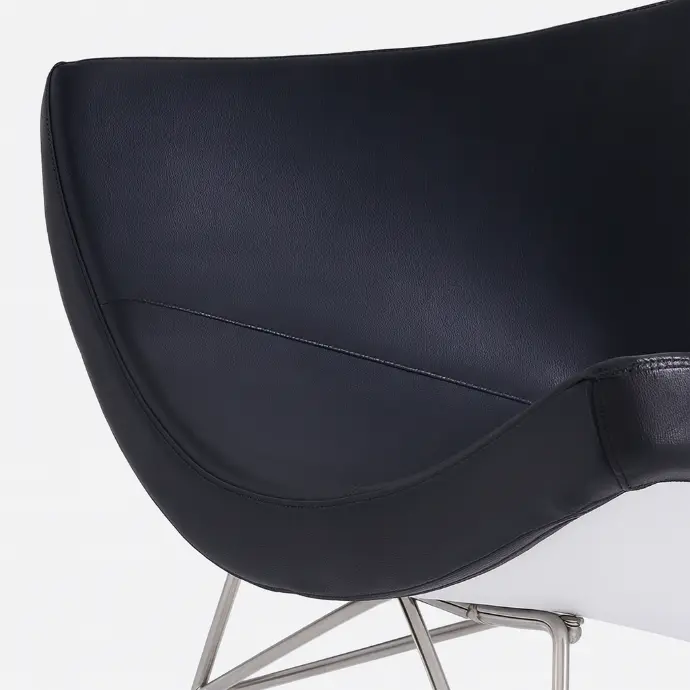 The Coconut Chair features a molded fiberglass shell with a smooth white lacquer finish, resembling a section of a coconut shell. The seat cushion is upholstered in premium aniline leather or high-quality fabric, filled with dense polyurethane foam for lasting comfort. The minimalist contrast between the white shell and dark upholstery accentuates Nelson’s modernist aesthetic.