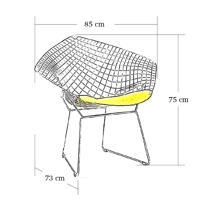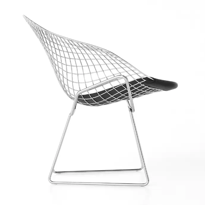 The chair is made from chrome-plated steel wire with an anti-corrosion treatment. The supporting frame is constructed from tubular steel with a polished chrome finish that is resistant to scratches and oxidation. An optional seat cushion in aniline leather with a high-density foam core provides additional comfort.
