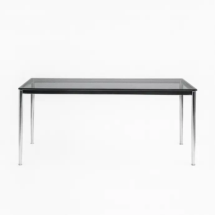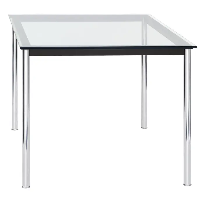 The LC10 Dining Table combines a tubular steel frame with square-profile legs in polished chrome, resistant to scratches and corrosion. The tabletop is available in clear tempered glass or in lacquered surfaces, offering a refined modernist appearance. The contrasting steel and glass highlight Le Corbusier’s vision of structural transparency and material honesty.