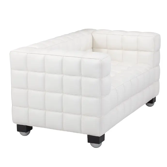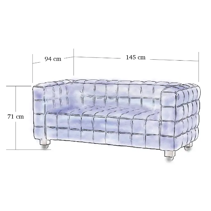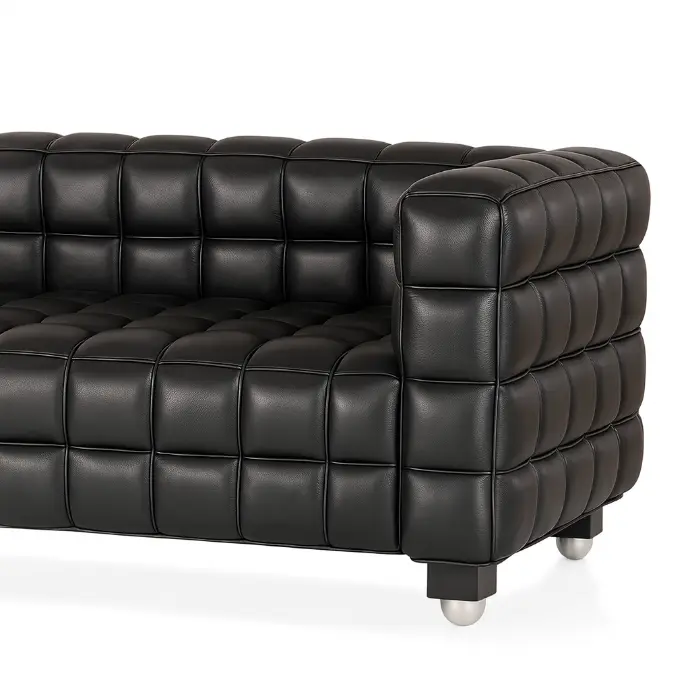 The Kubus Sofa is upholstered in premium aniline leather, carefully hand-stitched and quilted into square panels that create its characteristic geometric pattern. The frame is built from solid hardwood, concealed beneath the upholstery, and the base rests on discreet wooden feet finished in dark stain. The use of high-quality leather and precise handcraft reflects Hoffmann’s pursuit of modernist luxury and clarity of form.