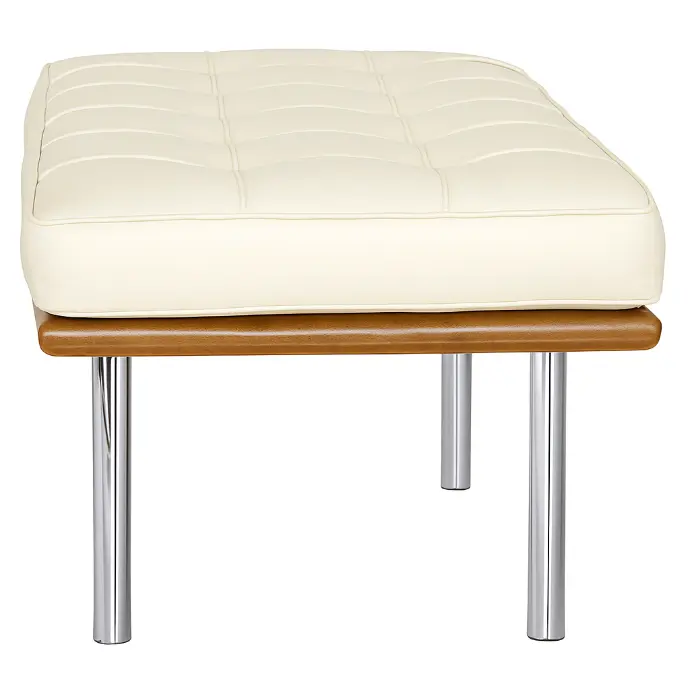 The Barcelona Bench combines a solid hardwood frame with polished stainless steel legs, mirror-finished for corrosion resistance. The seat is upholstered in premium aniline leather, hand-cut and stitched into a grid pattern with deep button tufting. The refined union of wood, leather, and steel reflects Mies van der Rohe’s Bauhaus-inspired pursuit of material clarity.