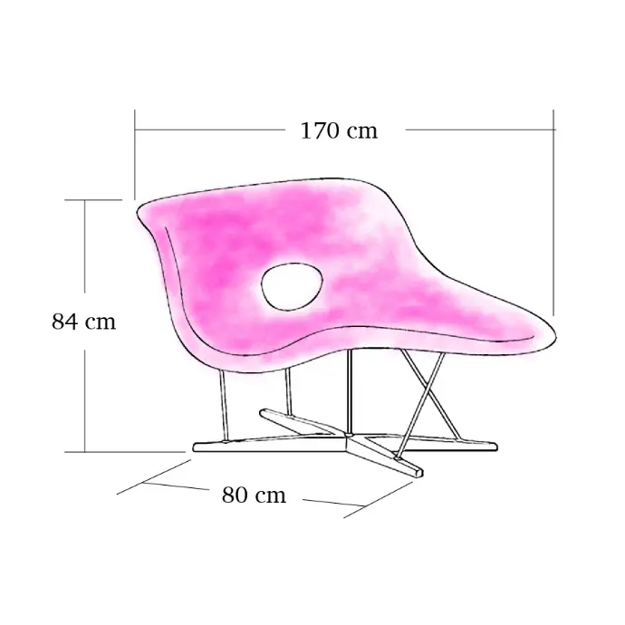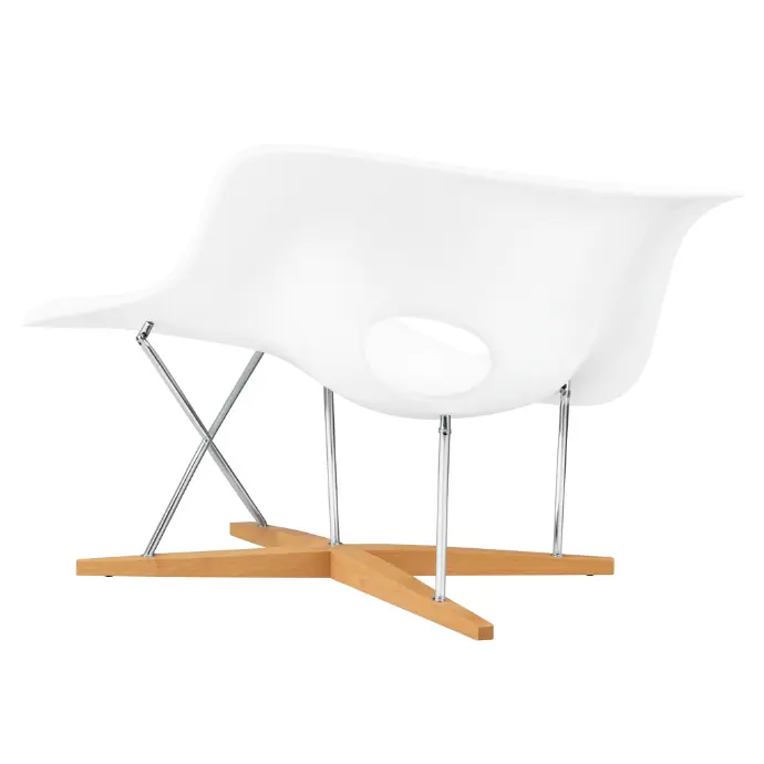 The La Chaise features a sculptural shell made from two bonded fiberglass layers with a high-gloss white lacquer finish. The base consists of chromed steel cross rods and solid oak feet, providing stability and warmth through material contrast. The fiberglass surface is smooth, durable, and easy to maintain, reflecting the Eames’ mastery of organic form and material innovation.