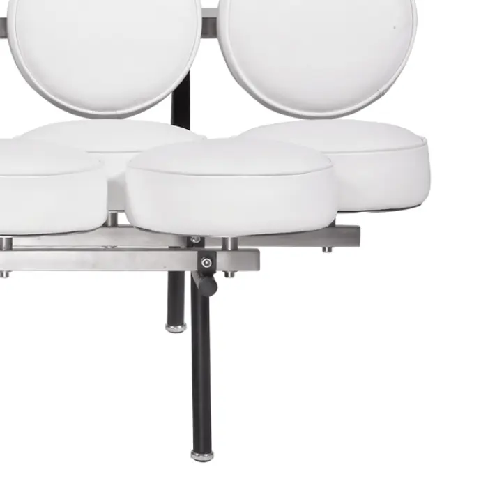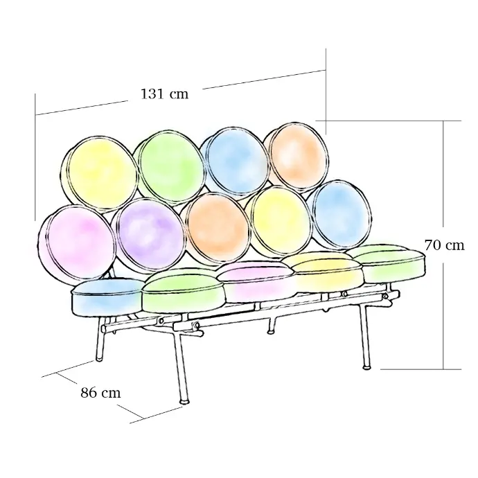 The Marshmallow Sofa consists of a tubular steel frame in a powder-coated or polished finish, supporting a series of individual circular cushions. The cushions are upholstered in premium leather or fabric, filled with dense foam for durability and comfort. The playful repetition of shapes creates a bold modernist aesthetic.
