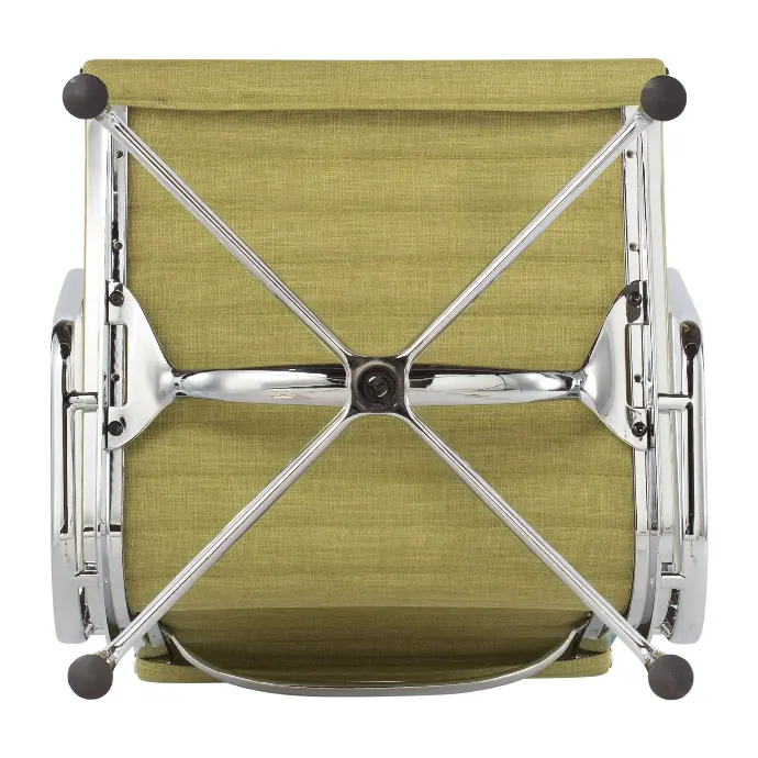 The chair’s structure is based on tensioned linen stretched over precision-formed aluminum side profiles, reinforced with horizontal padding for stability. The four-star fixed base ensures stability while maintaining a lightweight appearance. Upholstery is hand-stitched with reinforced seams, and all joints and edges are polished for safety and longevity. Integrated polished aluminum armrests complete the design with seamless geometry.