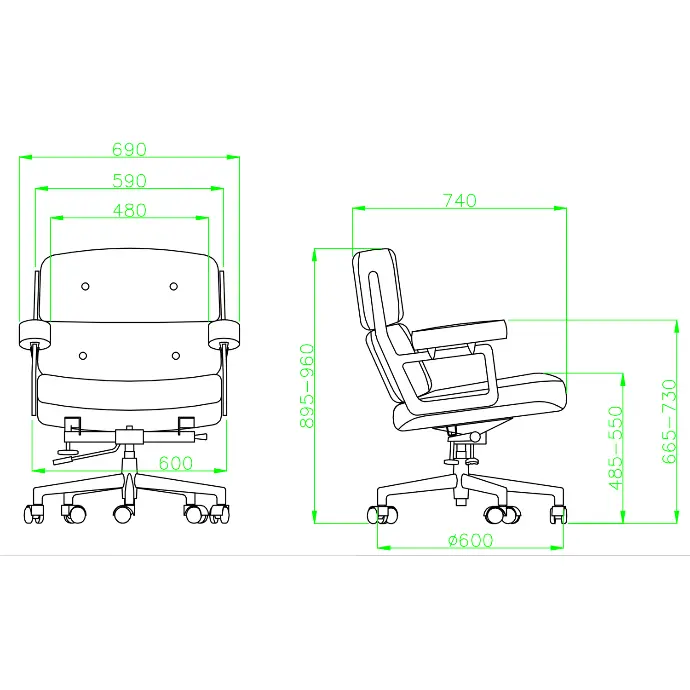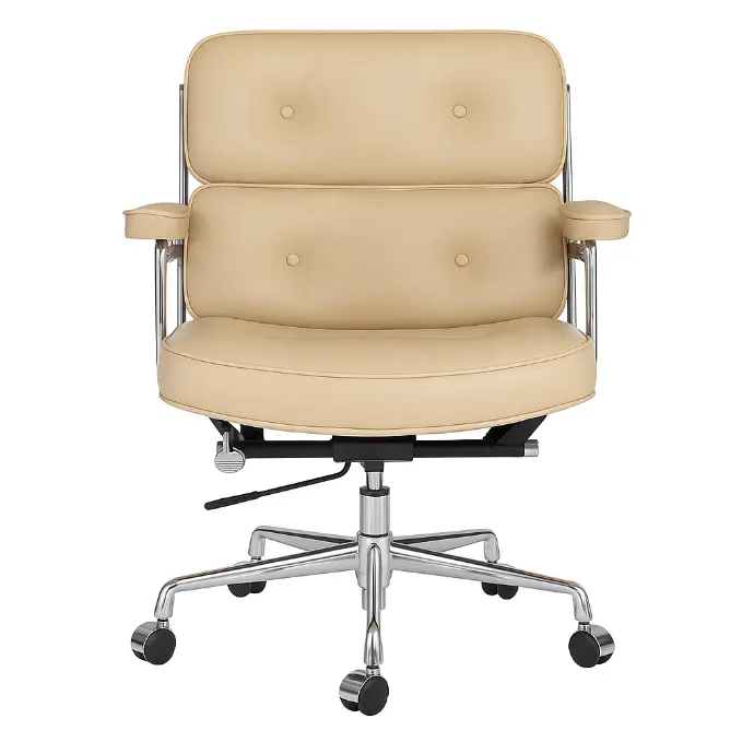 The Eames Lobby Chair ES 104 is constructed with a die-cast aluminum frame and five-star swivel base in polished finish, resistant to scratches and corrosion. The seat, backrest, and armrests are upholstered in premium aniline leather, filled with high-density foam padding, and accented by button tufting. The refined combination of metal and leather conveys both luxury and modernist precision.