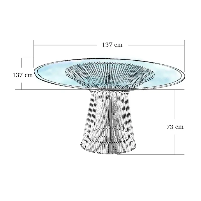 The table’s open wire base provides generous legroom while remaining structurally solid. Its round top promotes social interaction and is available in multiple finishes to suit different interiors. Practical yet iconic, the Platner Dining Table integrates easily into both residential and professional environments. As part of Warren Platner’s 1966 collection, it represents a fusion of modernist structure and decorative elegance.