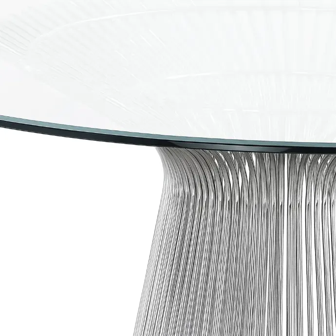 The base is crafted by welding dozens of vertical steel rods to circular reinforcements, combining structural stability with visual transparency. Each joint is precision-welded and hand-polished to maintain seamless curves. The tabletop rests securely on the welded base with hidden fasteners, ensuring stability while maintaining a floating appearance. Glass or marble tops are beveled and reinforced for safety and strength.