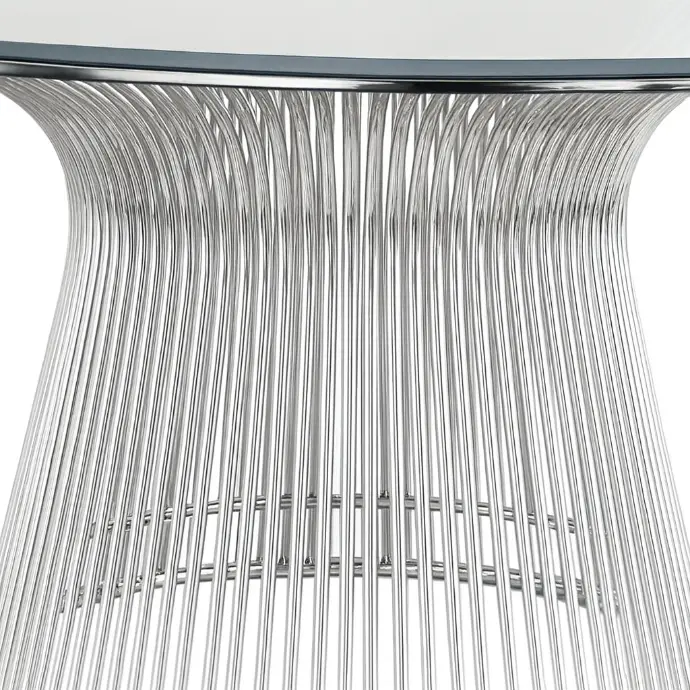 The Platner Dining Table features a base of nickel-plated steel rods, welded to circular horizontal frames to create a sculptural, flared profile. The tabletop is available in clear tempered glass, marble, or wood veneer, providing durability and elegance. The nickel finish is polished and treated for resistance to corrosion and scratches, highlighting the reflective quality of the steel.