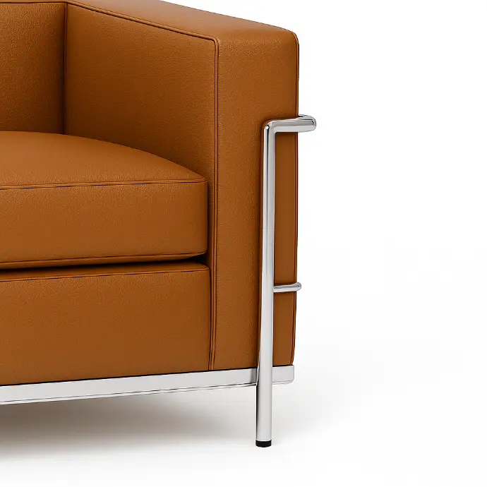 The LC2 Sofa is constructed with a visible tubular steel frame in polished chrome, providing corrosion and scratch resistance. The cushions are upholstered in high-quality aniline leather, with a choice of black or natural tones, and filled with polyurethane foam for resilient comfort. The juxtaposition of leather and steel embodies the Bauhaus ideal of clarity, function, and honesty in materials