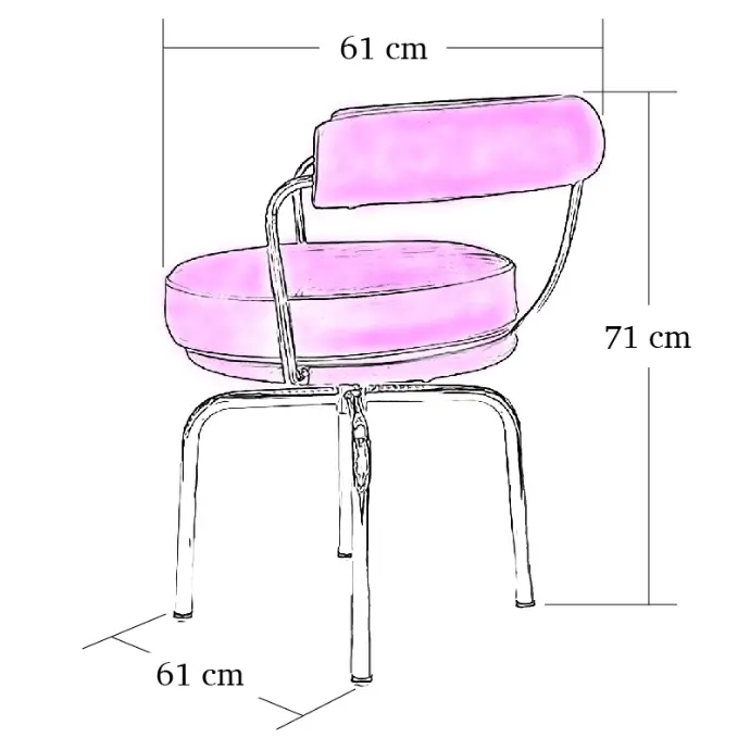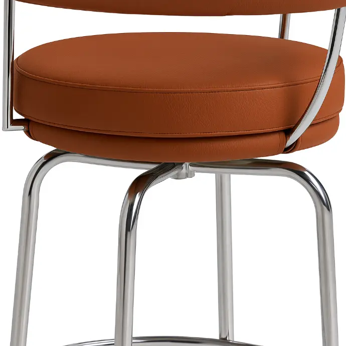 The padded circular seat offers firm yet ergonomic comfort, supported by dense foam cushioning. The curved backrest adapts naturally to the user’s posture, providing support without restricting movement. The swivel mechanism adds functional versatility, making the LC7 suitable for dining, office, or lounge settings. Its compact geometry and balance of steel and leather integrate seamlessly into modern interiors.