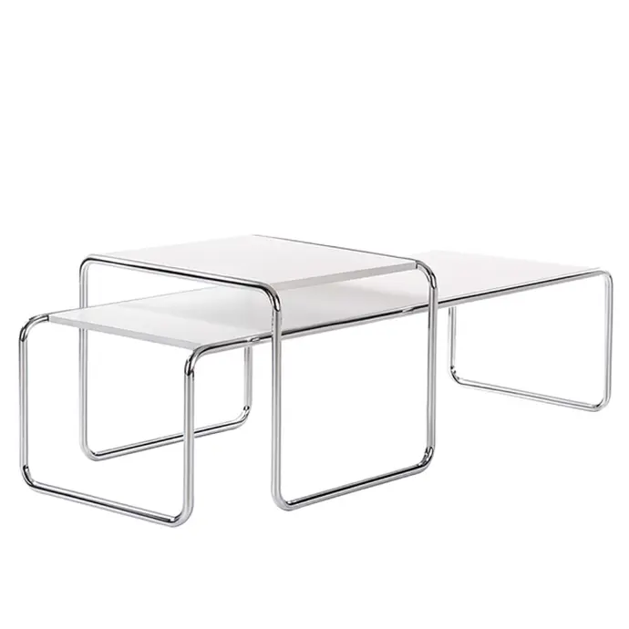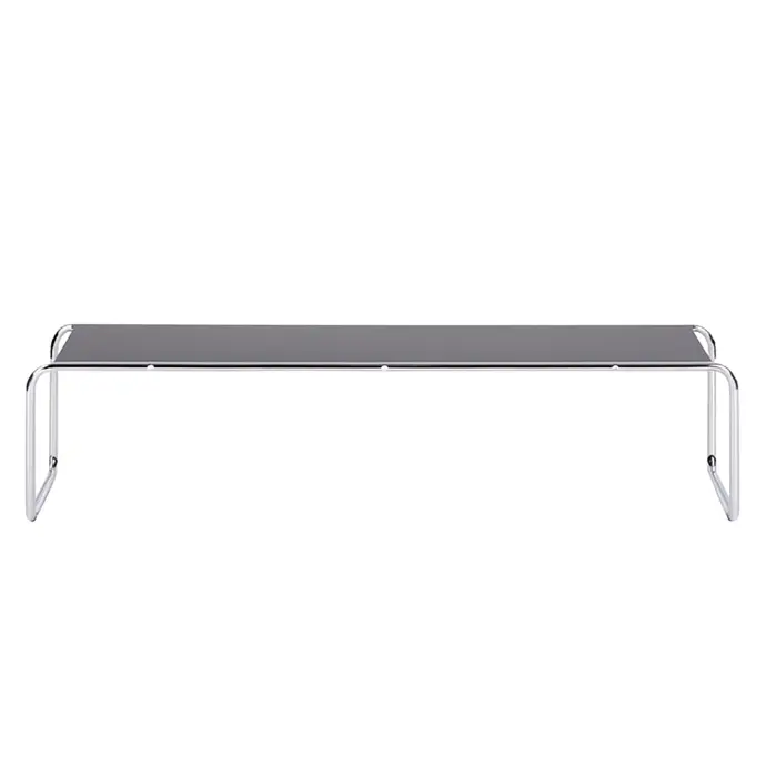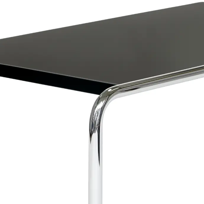 The Laccio Coffee Table features a tubular steel frame with a polished chrome finish that is resistant to scratches and corrosion. The large rectangular tabletop is crafted from high-pressure laminated wood, lacquered in black or white, providing a sleek and durable surface. The material pairing highlights the Bauhaus philosophy of simplicity and clarity of form.