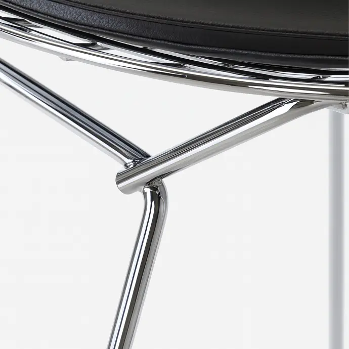 The chair is made from chrome-plated steel wire with an anti-corrosion treatment. The supporting frame is constructed from tubular steel with a polished chrome finish that is resistant to scratches and oxidation. An optional seat cushion in aniline leather with a high-density foam core provides additional comfort.
